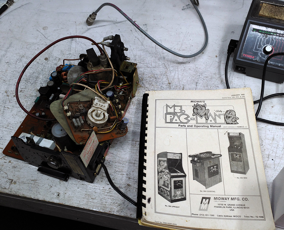 I’m not sure how this mashup of Pac-Man exterior and Mrs. Pac-Man interior came to be, but a friend/co-worker purchased it at an estate sale for 100 bucks(the same one that bought the Korgs). It too was partially working. When plugged in, it would light up, and you could here all the game sounds perfectly; but there was no picture on the screen. I figured, best case, blown fuse, caps, etc… Worst case, blown tube, fried board/s… Either way, a hundred bucks was a good price, even as a conversation piece. So he bought it, and came and dropped it off at my mom’s house till I could get with Uncle Tim and go over it completely. (Side Note – DO NOT mess around with CRT Displays. They contain Extremely HIGH Voltage components, and can literally kill you if mishandled!!!)